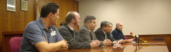 Top photo: North Adams Board of Health Officer Manuel Serrano, left; Michael Feeney, state Department of Public Health's Indoor Air Quality Program; Public Safety Commissioner E. John Morocco; Mayor John Barrett III; School Superintendent James Montepare, and Joseph Jammallo, principal of Cushing, Jammallo & Wheeler Inc. hazmat cleaners, at City Hall