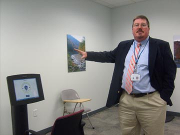 The office has combined the licensing and registration windows so that employees no longer have to walk back and forth between the divisions, making their work area more efficient and reducing wait times. Western Region Director Joseph O'Neill also demonstrated the testing room for new drivers that has two stations with touch screens that ask a random 20 questions to each applicant.