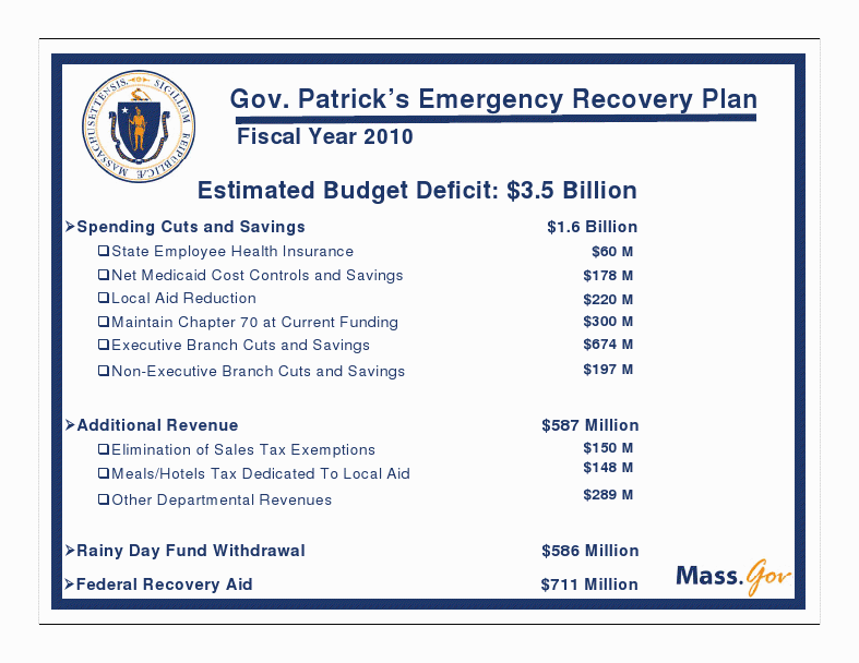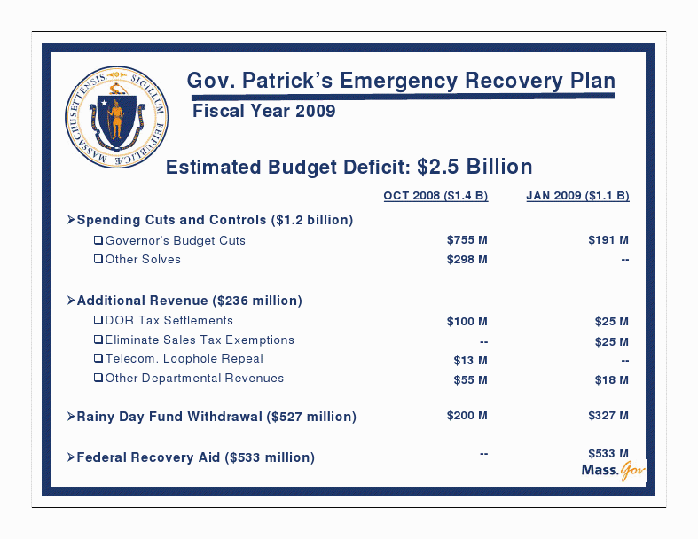 "The national recession is inflicting serious pain across Massachusetts, from household budgets to the state's balance sheets, and like many residents throughout the commonwealth, we have to make do with less," said Patrick. "At the same time, we also have opportunities. The Economic Recovery Plan leverages reforms and responsible budgeting that could help alleviate the mounting pressure on our communities now and in the future."