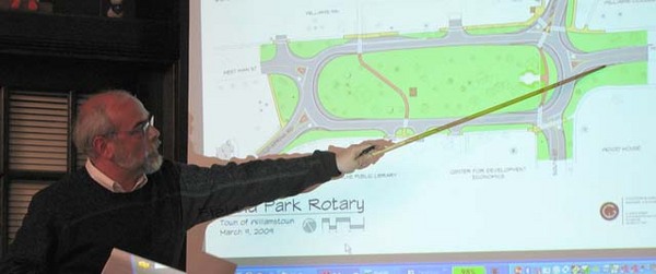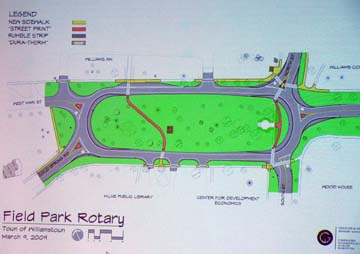 ![]() A rendering of the Field Park improvements presented at Monday's Selectmen's meeting. Not the paths through the park, rounded ends and islands at entrance points. Top photo, Director of Public Works Timothy Kaiser explains the changes. |