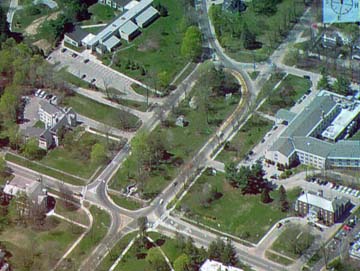 While the traffic is flowing, tractor-trailers are taking a toll on the park's edges and on the granite curbing near the information booth because of trucks over- or undercutting the turn. As they take the turn up toward the library, they often drive on the grass because of park's asymmetrical shape on its west end.