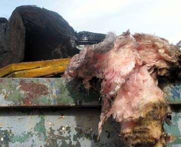 Above, a burned and melted potato chip rack lies outside the Cumberland Farms on Main Street. Left, burnt insulation from the roof is piled in a waste container. |