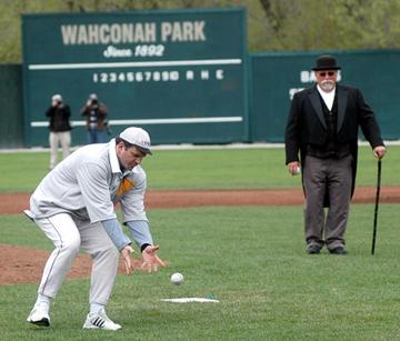 The vintage game celebrating the 150th anniversary of college baseball was played by faculty and alumni. Top: Williams alum and Pirates owner Robert Nuttingham, second from right, reads a proclamation from MLB Commissioner Bud Selig. To his right are Pittsfield Defender owners Dan Duquette and Buddy Lewis. |