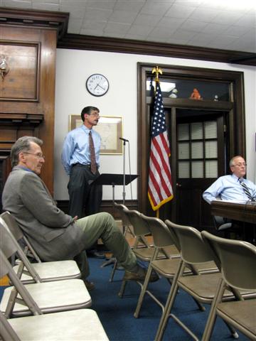 ![]() Stephen Pagnotta, at the microphone, explains some of the details of affordable housing project planned for the former St. Raphael's Church; Affordable Housing Committee Chairman Charles Bonenti is at left. |