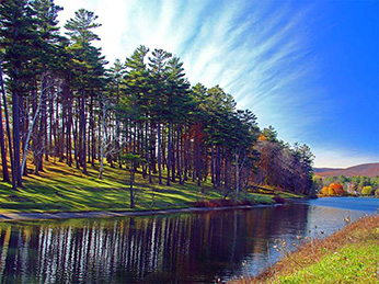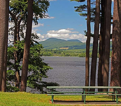 Top, picturesque pines line the banks of Pontoosuc. Right, Saddleback Mountain as viewed from the picnic area. |
