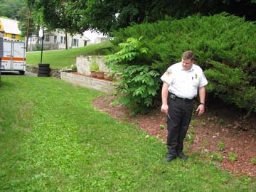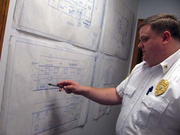 ![]() Ambulance manager John Meaney Jr. points to where the new bay will be located on Harris Street. The addition will blend in on the exterior. |