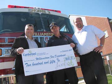 ![]() Cumberland Farms division General Manager Jeff Cutting, left, Fire Chief Craig Pedercini and the chain's regional manager Tom Colpack hold a big check. More photos will be posted Monday. |