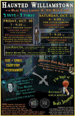 Sponsored by the Friends and Trustees of the David and Joyce Milne Public Library, Haunted Williamstown, will take place at the library Friday, Oct. 30, and Saturday, Oct. 31. Free parking will be available at the library and at the Williams Inn.