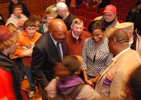 Actor and athlete Jim Brown says his dream is to 'be a catalyst for social change.' Top, fans surround him after his talk in Chapin Hall. |