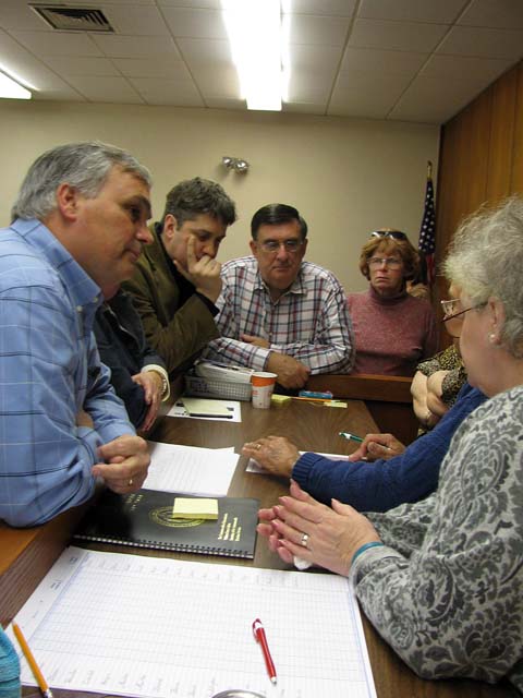 ![]() David Lamarre and Keith Bona, both at left, wait for a decision on a challenged ballot on Saturday at City Hall. |