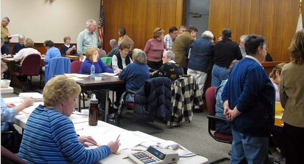 Election officials were working in teams of two — one reading off names and the other marking them on a control sheet — on packets of 50 ballots at a time. Counters were toting up the control sheets as they were completed. Challenged votes meant a huddle with Gomeau, members of the Board of Registrar of Voters and the candidates.