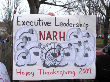 Only yards away, union members were chanting "They say cutback, we fight back" as some pounded on plastic tubs turned impromptu drums. Vehicles driving by honked horns as members waved signs, including one that showed hospital administrators as turkeys.