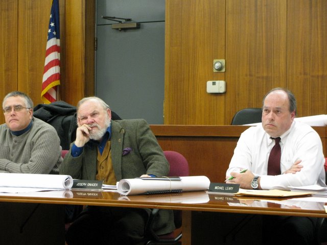 Councilor Michael Bloom makes a point to Planners Paul Hopkins and David Babcock. Fellow Councilors Keith Bona, Alan Marden, Lisa Blackmer and President Ronald Boucher listen with attorney Jay Sabin |