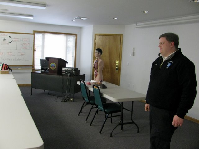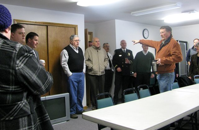 Board President Robert Moulton Jr. tells how John Leu (in tan jacket) has been involved with the service for 55 years. Moulton's been with the service for 35. Below, Meaney gave a tour the week before. |