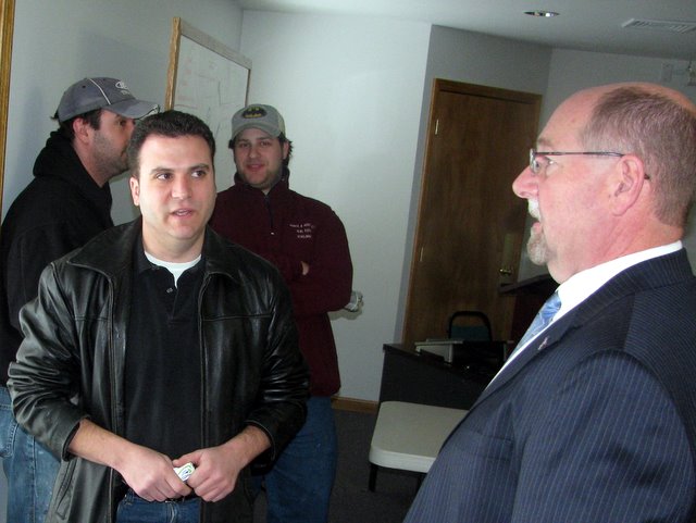 David Moresi, the contractor for the project and a part-time EMT, talks with Mayor Alcombright. |