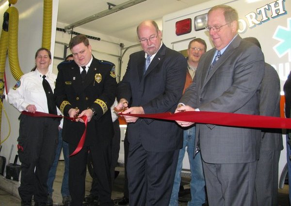Moulton was joined by Mayor Richard Alcombright and Adams Co-op President Joseph F. Truskowski Jr. in cutting a wide red ribbon held in front of the new ambulance bay.
