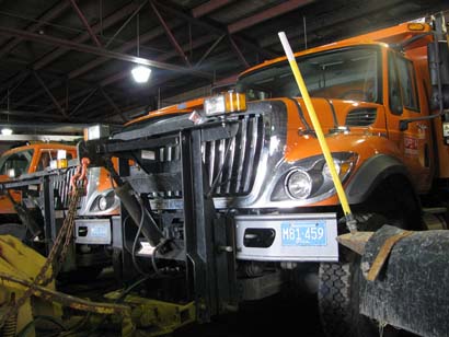 Plow trucks are lined up tight in the City Yard's garage on Ashland Street.