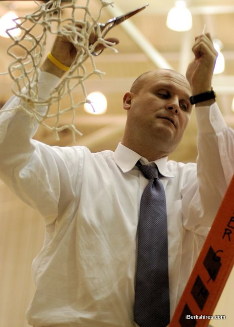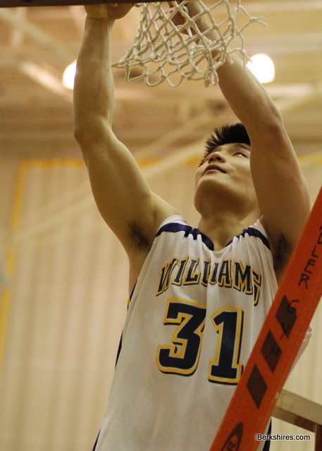 Head coach Mike Maker cuts off the trophy net after the Ephs took down Bates, 64-56 in the finals. Left, James Wang lead the team with 19 points.The Ephs will face the winner of Thursday's first-round game between Bridgewater State and Maine-Farmington on Saturday in the Chandler Gym; time to be announced. |