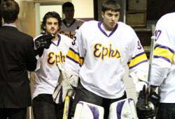 When senior goalie Marc Pulde was injured just before the Amherst game, Eph head coach Bill Kangas was in a bind. The rules state that you have to dress two goalies for each game and now his team was down to just one – sophomore Ryan Purdy.
