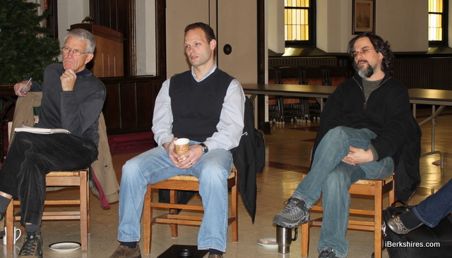 Mark Miller, Paul Gage and David Christopolis were among the nearly 20 people gathered at the meeting. |
