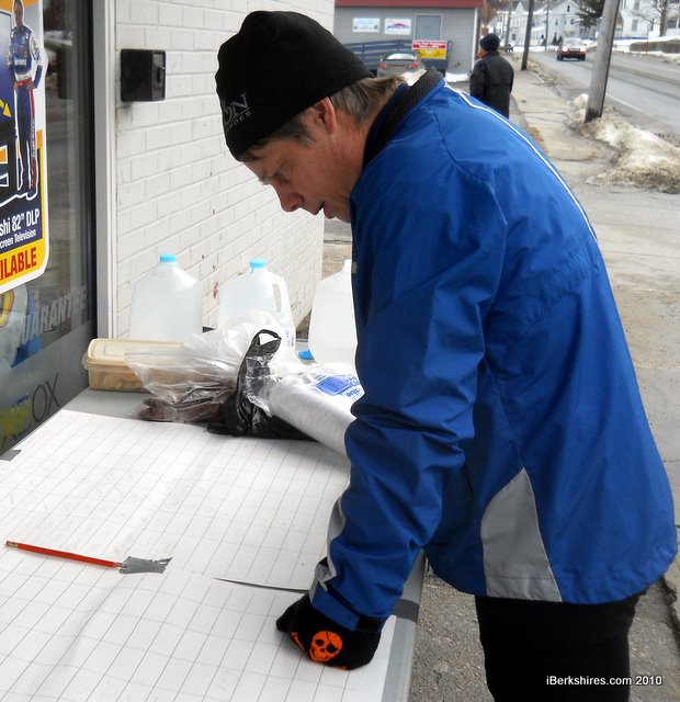 Bob Dion, race organizer, pours over lap results hoping to figure out who was winning. The race is not formally timed and runners compete on the honors system. |
