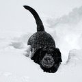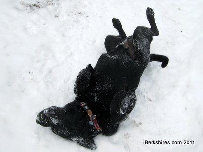 Clockwise from top: Rudy rolls with delight after a recent storm; helping with the shoveling; if you can see his nose, there's room for more snow.