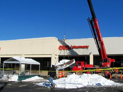 On Friday morning, a Wooliver crew was working with a crane from Wahconah Welding of Pittsfield to haul loads of snow off the roof of the Big Y building, which also houses CVS, Advance Auto Parts and a Dollar Store.