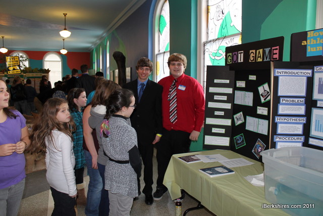 Taconic HIgh students Brandon Knights and Eamon Connor researched stereotypes related to gaming. The teens presented their research at a science fair at the Berkshire Museum on Thursday. |