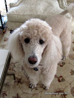 Meanwhile, Casey, a 3-year-old standard poodle, contentedly stretched out near the fireplace, his off-white fur blending with the rug. "I walk Casey on campus," said Falk who has noticed that the poodle, bred in more southern climes, shies away from snow.