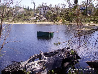 Two sights that still get to me are of the fireplace with the tree shoved into it and the back deck of one house sitting on the front lawn of another. Then there was the hot tub sitting atop a pile of branches in someone's front yard. Riding my bike along, there was a constant stream of people walking the street. I noticed as I moved along, that a lot of them were gawkers. One woman stopped me to ask "Is there really a car in the pond?" I overheard one teen say to a younger sibling, that it looked more like a "tree bomb" than a tornado. All the trees are gone.