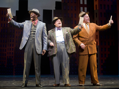 Alexander Dodge went all out designing the sets, with backlit skyscrapers climbing the proscenium even before the show began. They overflowed the stage yet left plenty of room for the dancing, the chases and the crowd scenes. Alejo Vietti designed the costumes with both cleverness and restraint. Less-assured designers often portray the gamblers and gangsters in cartoonish outfits, but not Vietti. There is a authentic period feel to his creations — enough so that it would make people stop and stare. But they were not so over-the-top that they would call the police. His designs were in service to the story. He managed to make the Hot Box dancers look like sexpots, but not quite floozies.