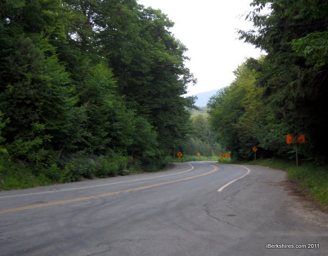 ![]() The Taconic Trail has a right turn just before the runaway truck ramp and the tree line cuts down visibility. The ramp is behind the brush jutting out on the right. |