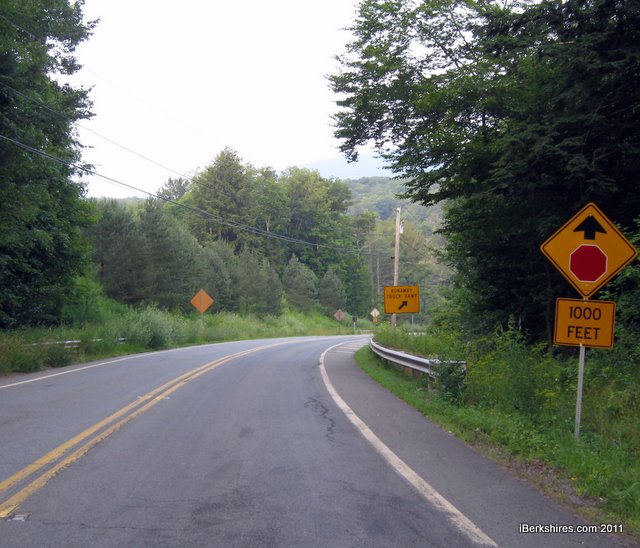 ![]() A view from the road as a driver approaches the runaway truck ramp on the Taconic Trail. The second sign on the right points to the ramp. |