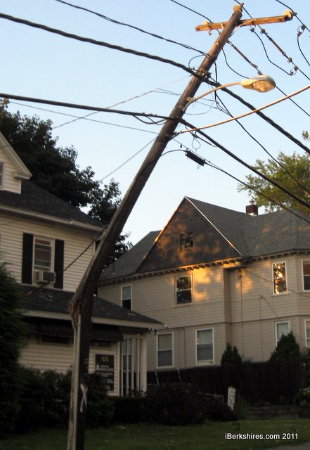 ![]() A telephone pole is on the verge of crashing to the ground outside of Berkshire Medical Center. |