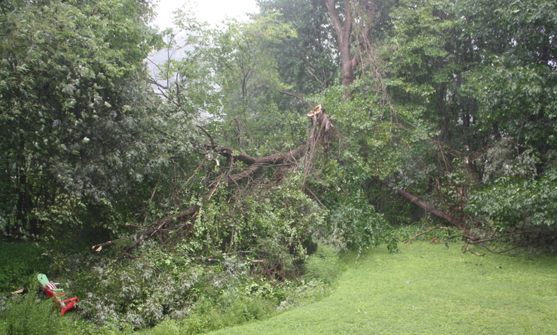 This photo from Cindy Brown of Pittsfield shows a tree downed by swirling winds in the back yard of her South Street home. The thunderstorm has left thousands without power prompted tornado warnings along the same path as the storms that hit in June. |