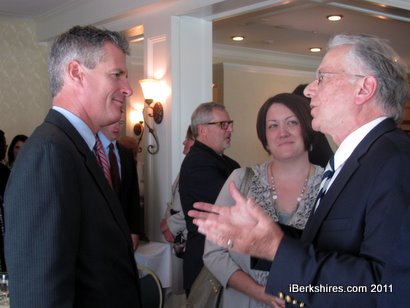 Brown speaks with Sherwood Guernsey, former state representative and a local Democratic leader. |