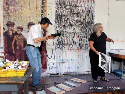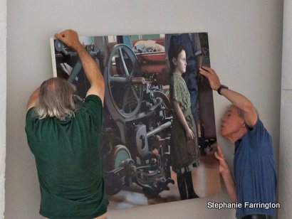 ![]() Brill and artist William Oberst hang one of Oberst's paintings for 'Mill Children.' |