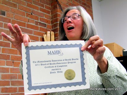 ![]() Paula Wells displays the certificate she received from the Massachusetts Association of Health Boards for completing its governance program. |