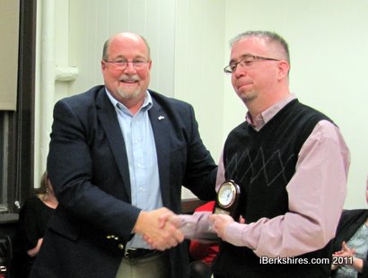 ![]() Schrade is presented with a plaque by Mayor Richard Alcombright at his last meeting with the School Committee on Tuesday. |