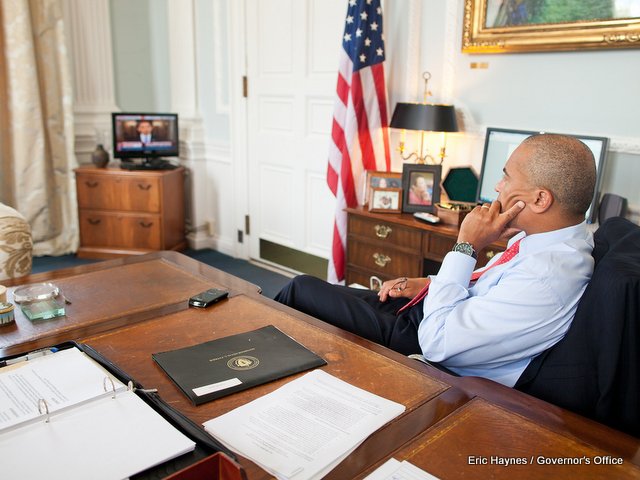 ![]() Gov. Deval Patrick watches the president's remarks about the Supreme Court decision upholding the Affordable Health Care Act. |