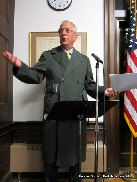 Town Manager Peter Fohlin models a trench coat left in the meeting room in hopes someone in the television audience would recognize the garment. |