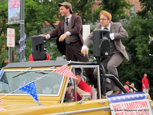 Two apprentices Michael Bradley Cohen, left, and Chris Bannow portray Sherlock Holmes and Dr. Watson in the Williamstown Theatre Festival's float during the town's Fourth of July parade.