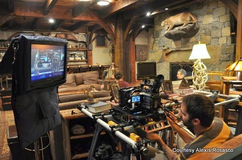Alexis Rosasco (left, and seated on the couch above) is using locations in Williamstown for her film. North Adams is also expected to be a backdrop. Above, director of photography Nicholas Jon Beaubien guides the camera across the dolly. |