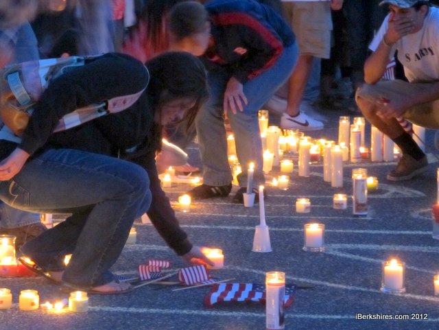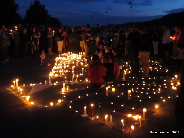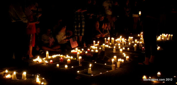 The hushed crowd placed hundreds of votive candles around the letters to illuminate them as music such as "Proud to be an American" played. The solemn memorial was punctuated by soft sobs, and as the illumination was completed, the mourners waved small American flags and held aloft candles.