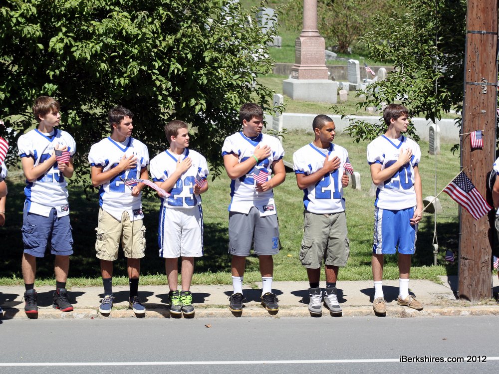 Near Center Street an array of veteran's organizations created a flag salute and ladder trucks from the Adams and North Adams fire departments extended over the street to fly a huge American flag.