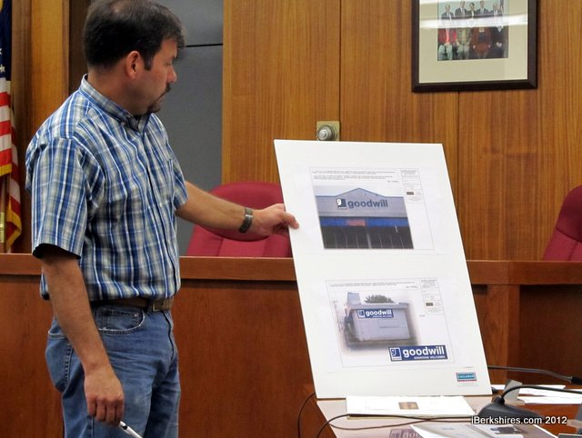 ![]() Building Inspector William Meranti show the Planning Board members what the outside of the new Goodwill will look like. |