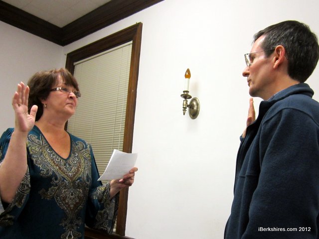 ![]() Kris Kirby, right, is sworn in as the newest member of Williamstown's Municipal Scholarship Committee. |