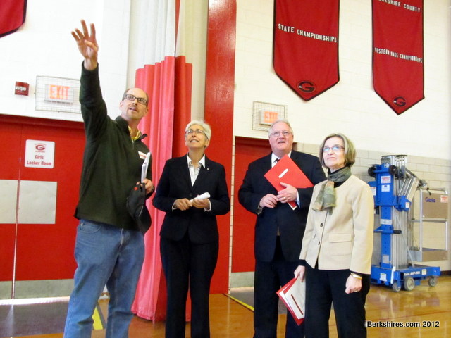 David Backus, a member of the Mount Greylock school building committee, explains some of the problems in the gym on Wednesday to state Rep. Gailanne Cariddi, left, and MSBA director Jack McCarthy with Superintendent Rose Ellis. |