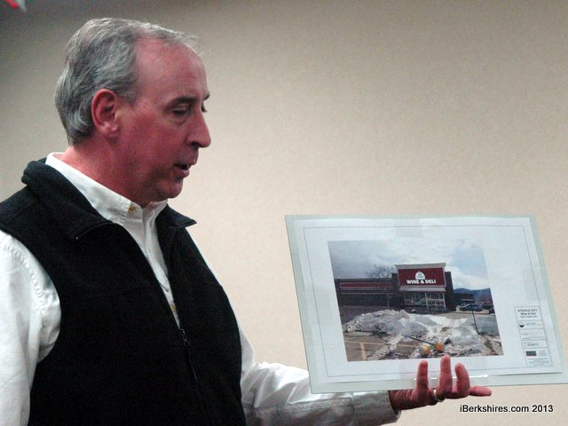 James Callahan presents the wine and deli shop sign design to the Redevelopment Authority on Monday. Steeple City Liquors Inc. will move its shop into the former Staples location.