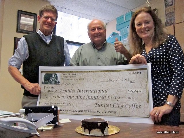 WILLIAMSTOWN, Mass. — Williamstown resident and Williams College professor Hank Art this week presented a $2,940 check to Achilles International on behalf of Tunnel City Coffee, which raised the money during its Memorial Day weekend Boston cream pie fundraiser.